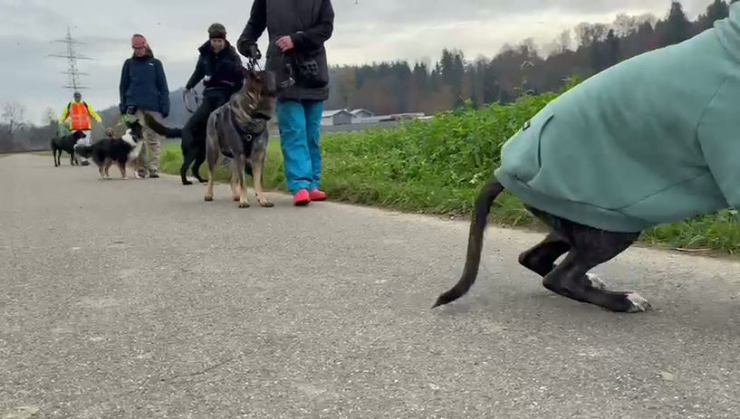Das Angebot dient vor allem dem Hund soziale Verhaltensweisen zu erlernen und zu schulen. Er wird dadurch selbstsicherer bei alltäglichen Hundebegegnungen. Durch kontrollierten Kontakt an der Leine werden die Hundehalter ihren Hund beobachten lernen und Einfluss auf ihn zu nehmen. Direkter Kontakt von 2 Hunden wird zwischen den jeweiligen Haltern abgesprochen. Ziel ist es durch das gemeinsame Laufen Spannungen und Unsicherheiten abzubauen. So ist die Basis für einen Schnüffelkontakt auf einer vertrauteren Ebene möglich. Die Gruppenleitung führt stets einen eigenen Hund und kann dabei anschauliche Übungen vorführen. Die Gruppe ist meist zahlreich. Es herrscht anfangs eine gewisse aufregende Energie. Mit der Zeit beruhigt sich die Dynamik. Für Angelegenheiten die das einzelne Team betreffen nehmen wir uns gern im Einzeltraining oder in den Gruppenstunden Zeit. Wer auf dem Gruppenspaziergang ein integriertes Einzeltraining wünscht, kann im Vorfeld Kontakt aufnehmen. Bei Neukunden ist für dieses Angebot ein Erstgespräch Voraussetzung. Mir ist es wichtig dass sich jeder wohl fühlt. Keine Vorurteile, keine Grüppchenbildung, keine Scham ; sondern rein ins Vergnügen und unter die Leute mischen. Um sich freier und sicherer bewegen zu können darf der Hund selbstverständlich auch den Maulkorb tragen! Ich befürworte den Maulkorb wenn jemand den Hund und seine Reaktionen nicht genau abschätzen kann. So kann der Hund in aufwühlenden Entwicklungsphasen trotzdem mit gewissen Reizen konfrontiert werden. Vorsicht ist immer besser wie Nachsicht.